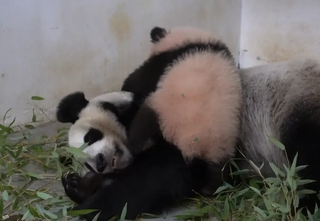 Малышка-панда из Московского зоопарка будит маму. Видео © Telegram / Светлана Акулова