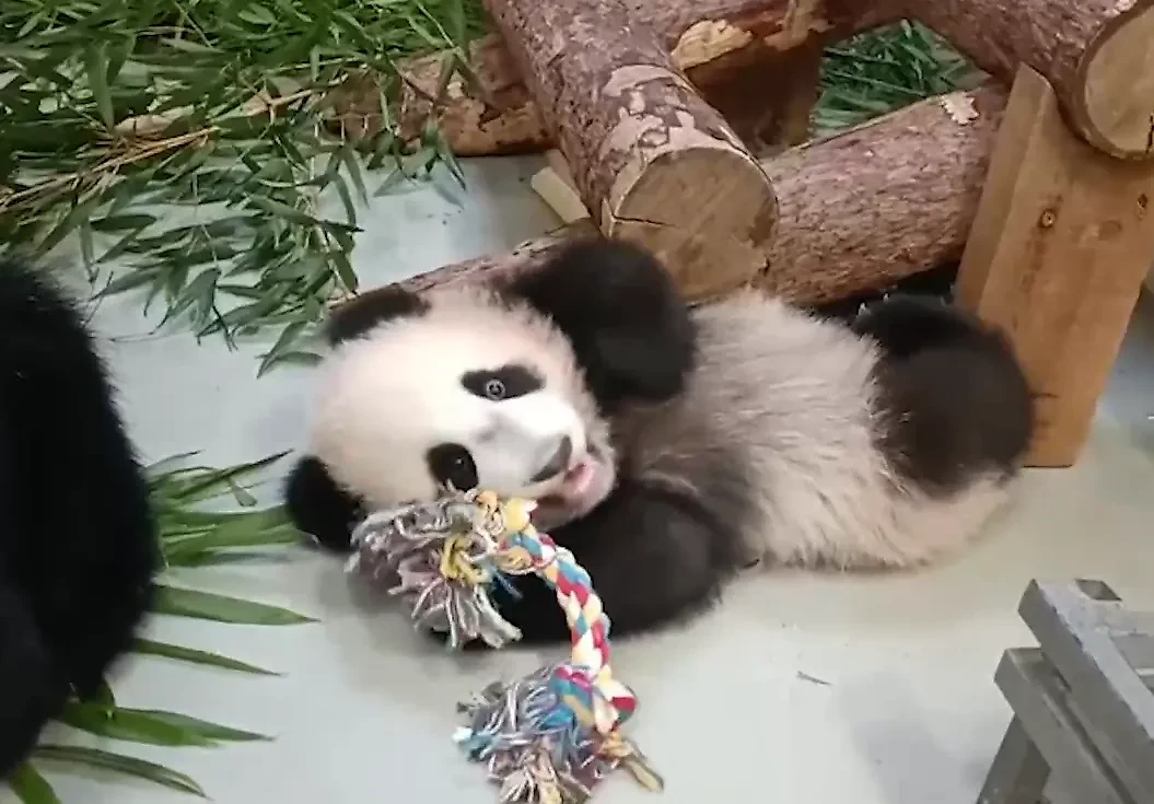 Панда Катюша играет с новой игрушкой. Видео © T.me / Светлана Акулова