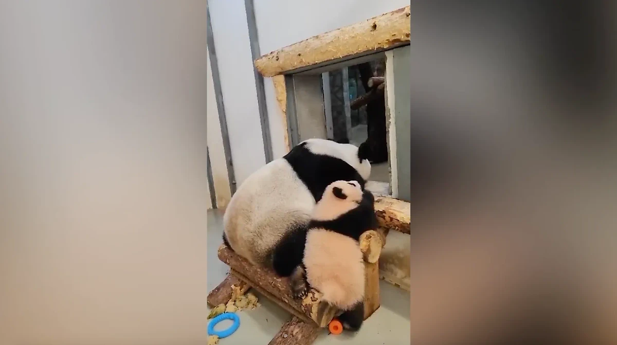 На кадрах двое из семейства чёрно-белых мишек отдыхают на лестнице из брёвен. Примечательно, что одна лапа малышки-панды уже не помещается на бревенчатой лестнице. Вероятно, для такого совместного сна им теперь нужна лестница пошире.