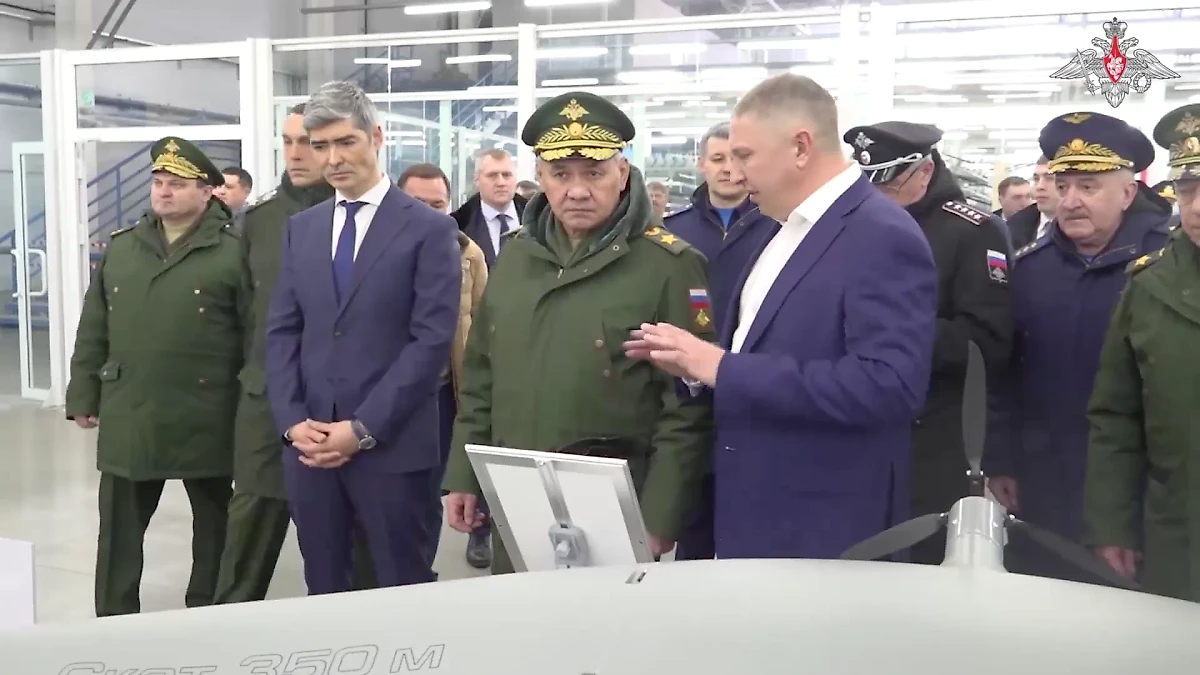 Глава Минобороны РФ Сергей Шойгу проверил выполнение гособоронзаказа по созданию БПЛА в Удмуртии. Видео © t.me / Минобороны РФ
