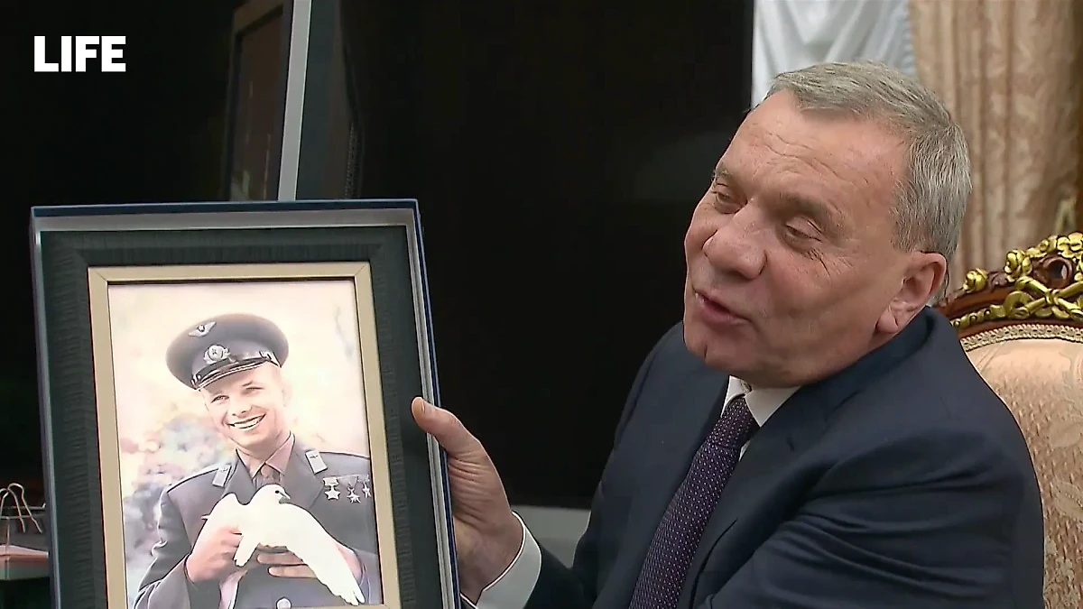 Глава "Роскосмоса" Юрий Борисов подарил президенту Владимиру Путину портрет Юрия Гагарина. Видео © Life.ru