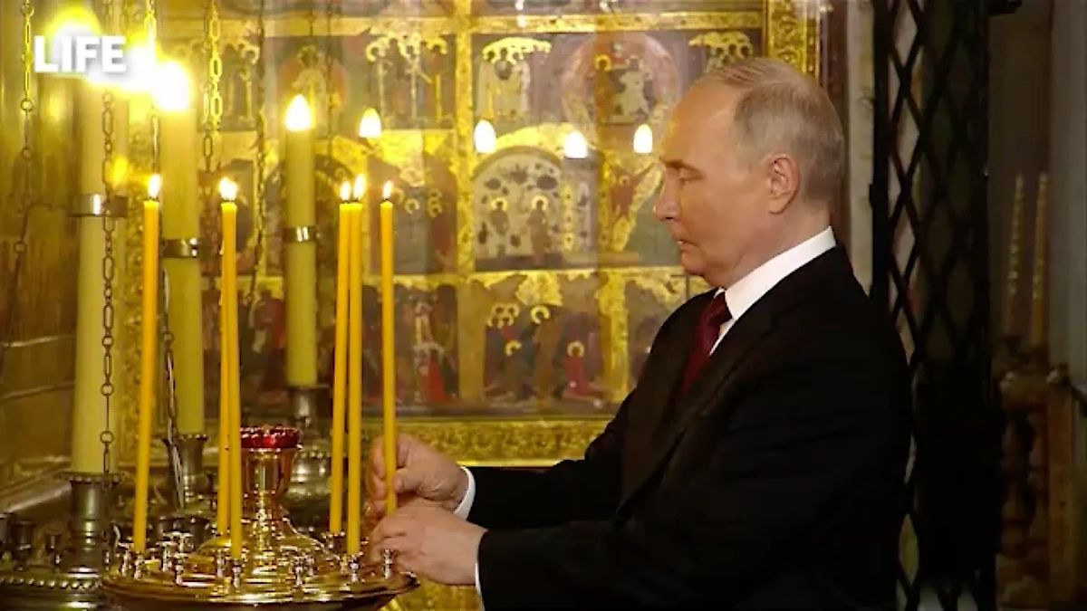 На видео — само таинство и глава государства, который ставит свечку и крестится.