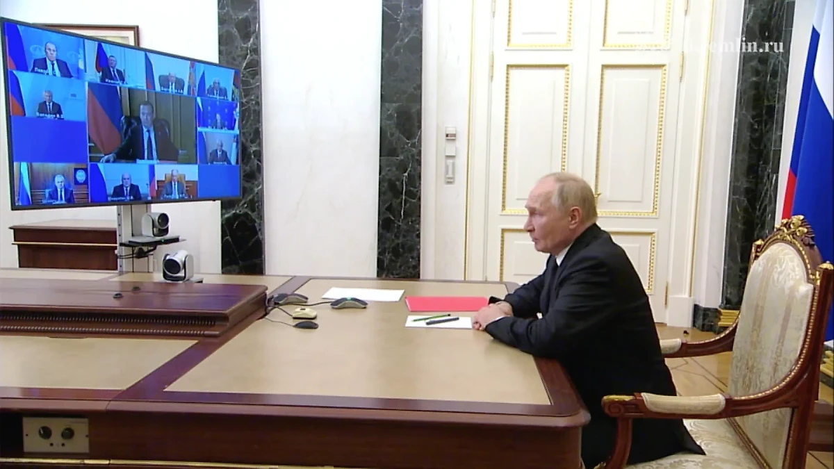 Начало онлайн-совещания президента России Владимира Путина с постоянными участниками Совбеза РФ. Видео © Telegram / "Кремль. Новости"